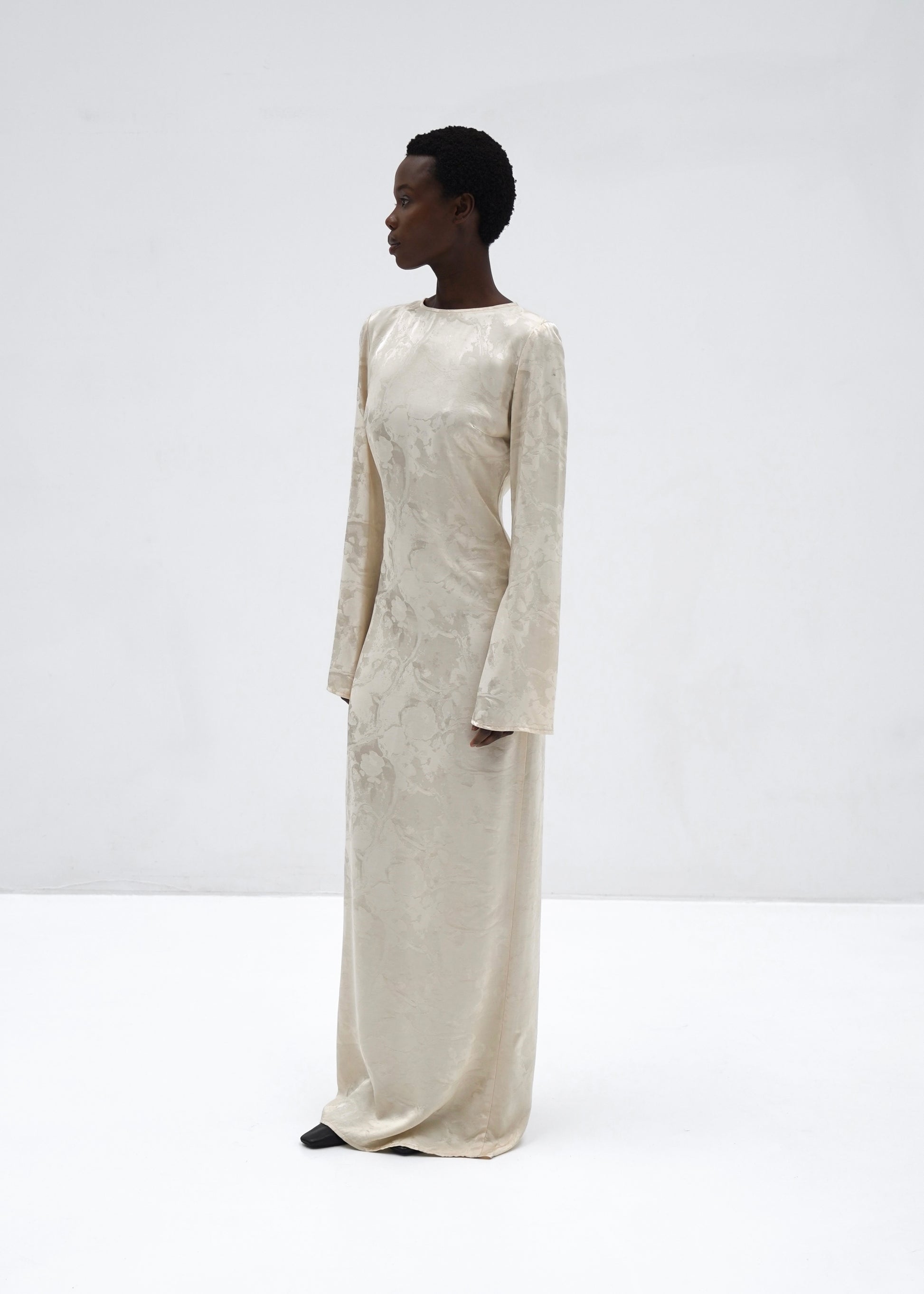 A floor-length dress made from a lightweight jacquard with an abstract tonal texture. The silhouette is clean and elongated, shaped subtly through the body to maintain ease and structure in equal measure.