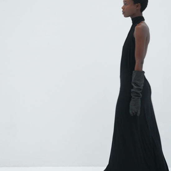 An elegant maxi-length dress crafted from soft, fluid bamboo fabric. The asymmetric draping gently accentuates the waist, elongating the silhouette, while the high neckline and open shoulders create a refined, sculptural look. A wrap-like detail at the hem adds natural movement and graceful flow.