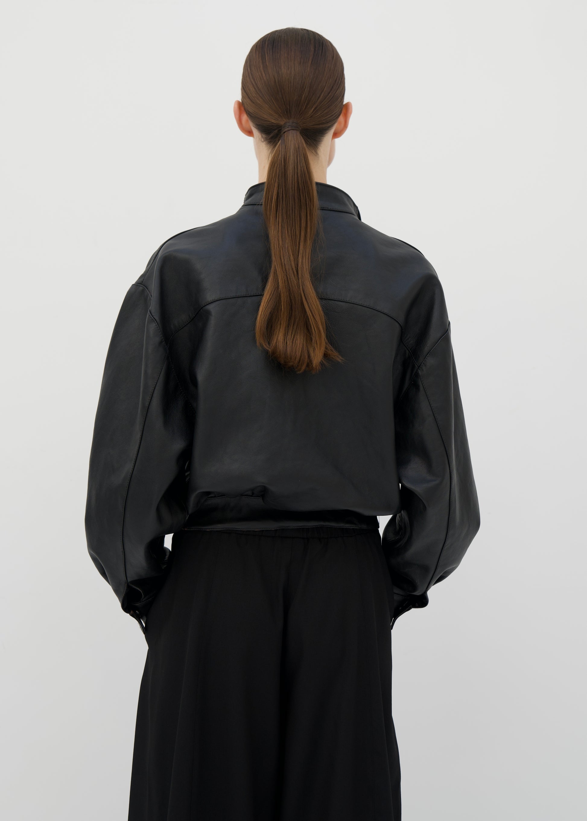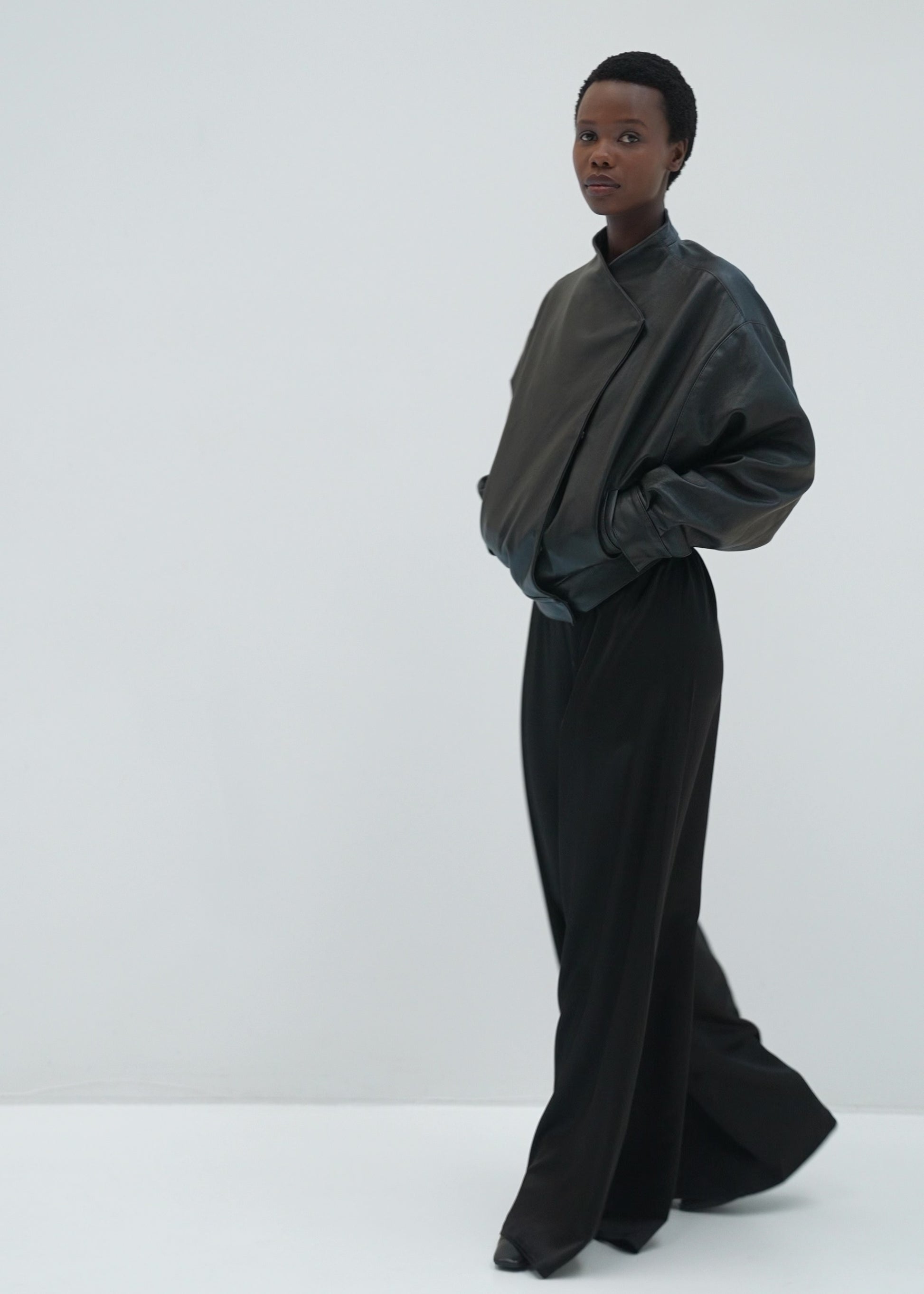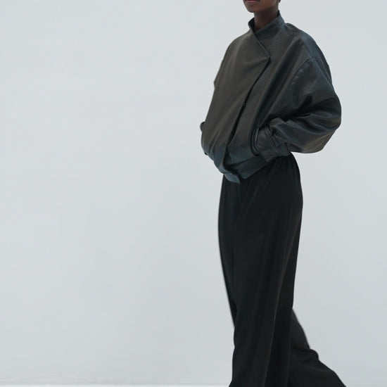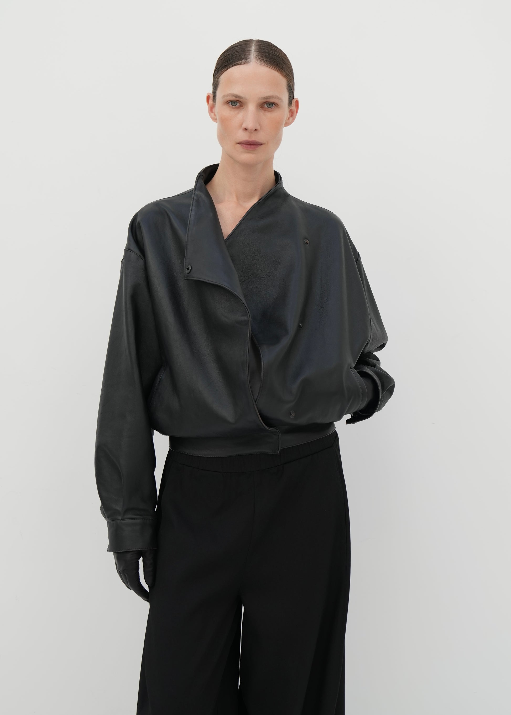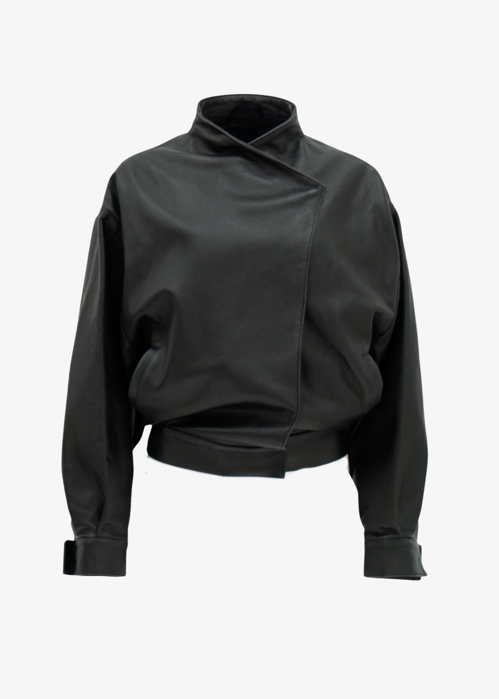 Handcrafted from supple calfskin leather, this jacket offers a refined interpretation of a kimono wrap silhouette. The soft V-shaped neckline creates an elegant, elongated line, while the asymmetric front closure adds a subtle architectural edge. The slightly rounded, relaxed structure allows the leather to fall naturally around the body, balancing ease with quiet sophistication. A timeless piece defined by purity of form and considered detail.