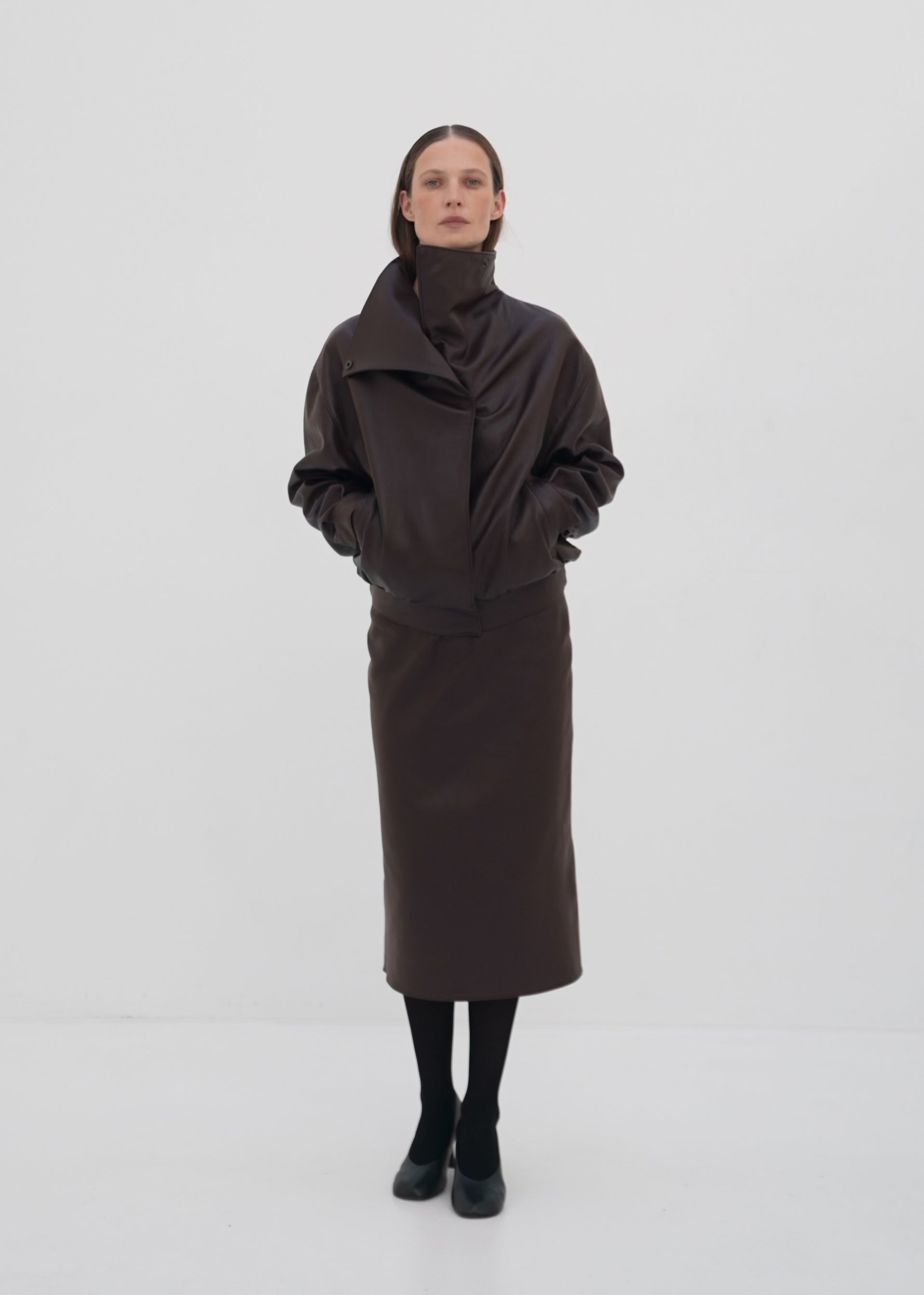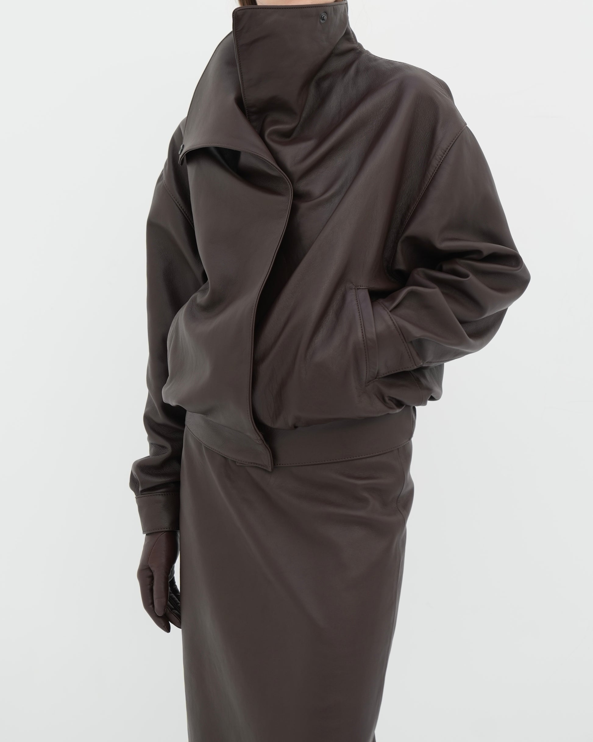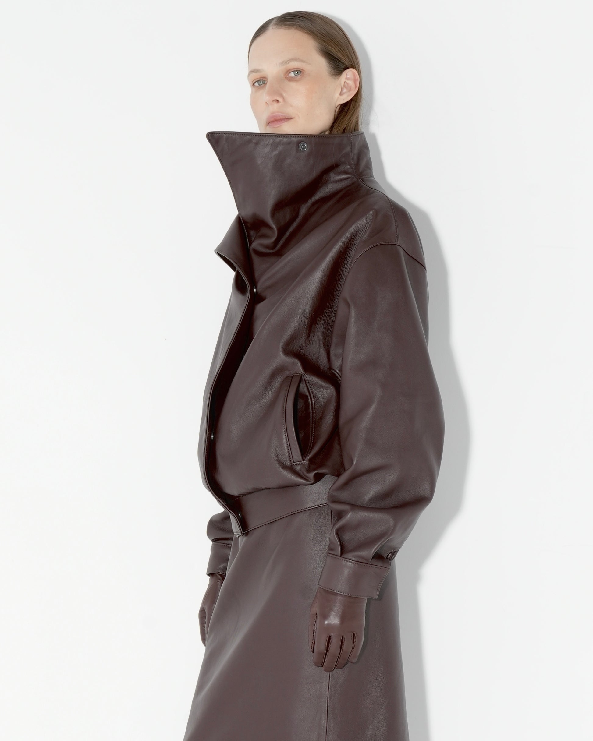 Hand crafted from supple calfskin nappa leather, this jacket embodies modern minimalism with an architectural edge. The oversized high collar creates a bold silhouette, while the clean lines and precise tailoring reflect refined craftsmanship. Fully lined for comfort, it features discreet side pockets and a relaxed fit that drapes effortlessly over the body.