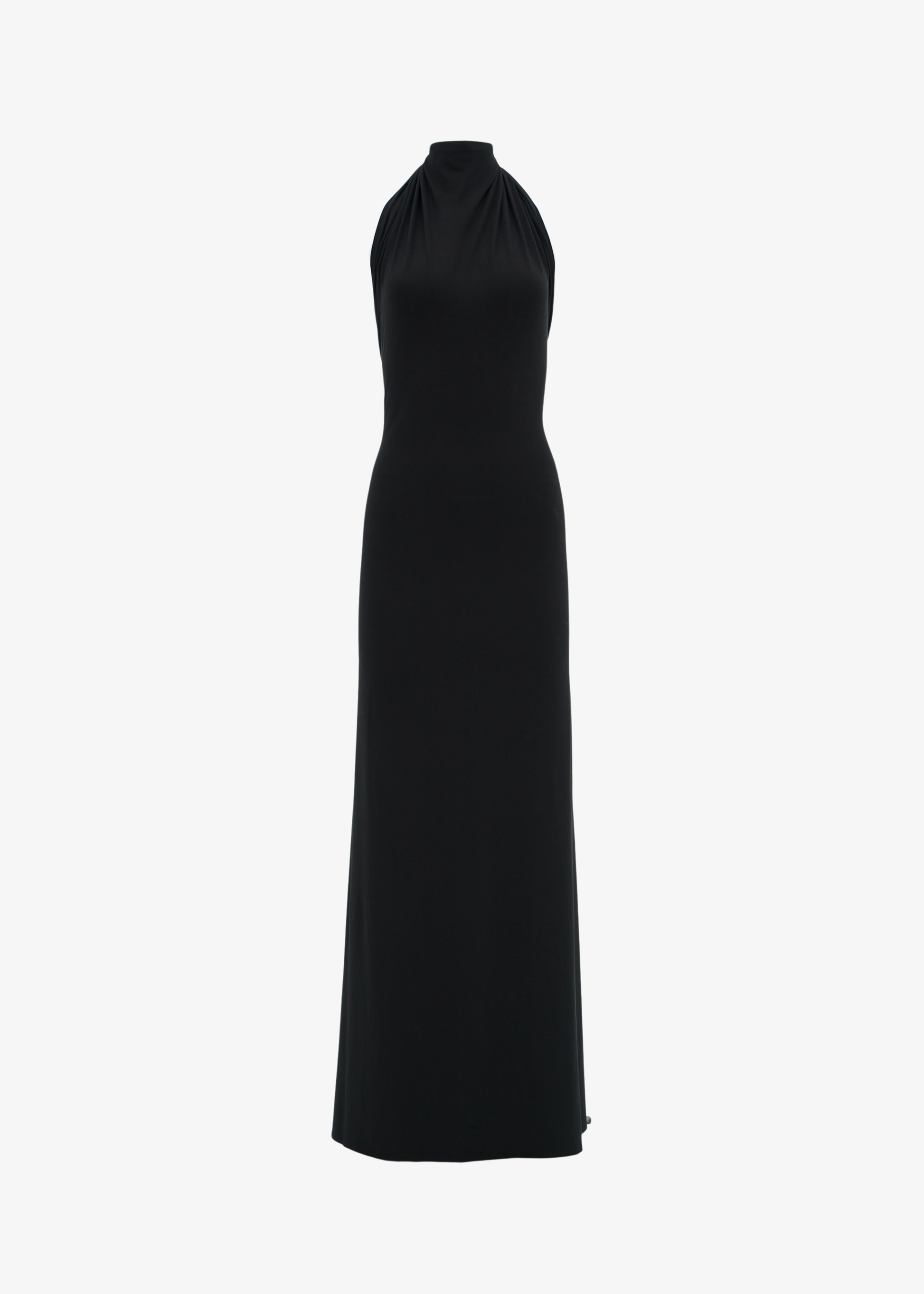 Flawless black dress with a V-neck at the back. Maxi length, halter-neck back closure.
