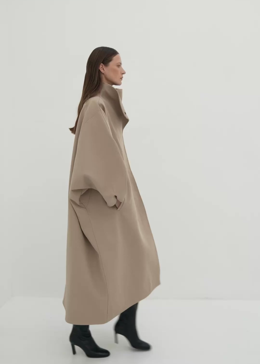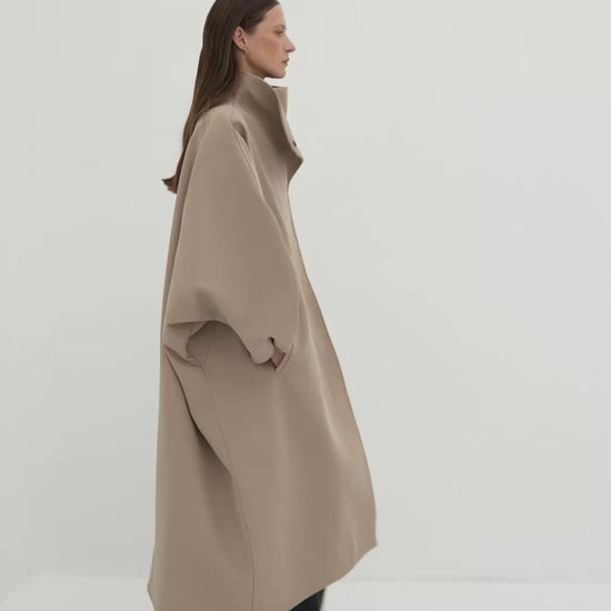 Oversized fit, two side pockets, asymmetrical length, stand-up collar, buttons on the sleeves. Made from smooth 100% wool fabric that retains its shape and keeps you warm in cold weather.
