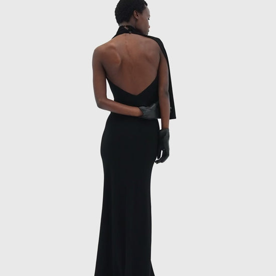 Flawless dress with a V-neck at the back. Maxi length, halter-neck back closure.