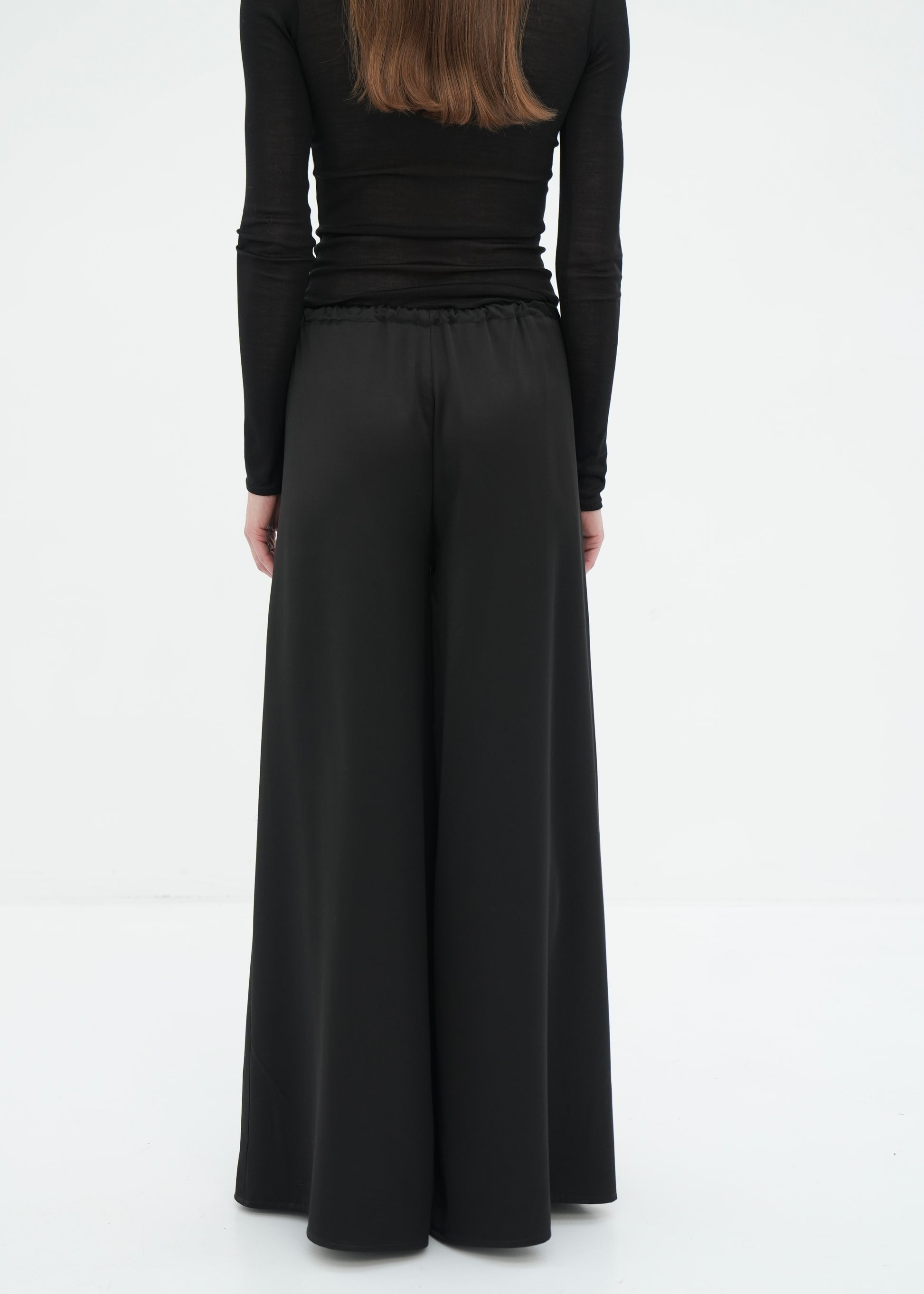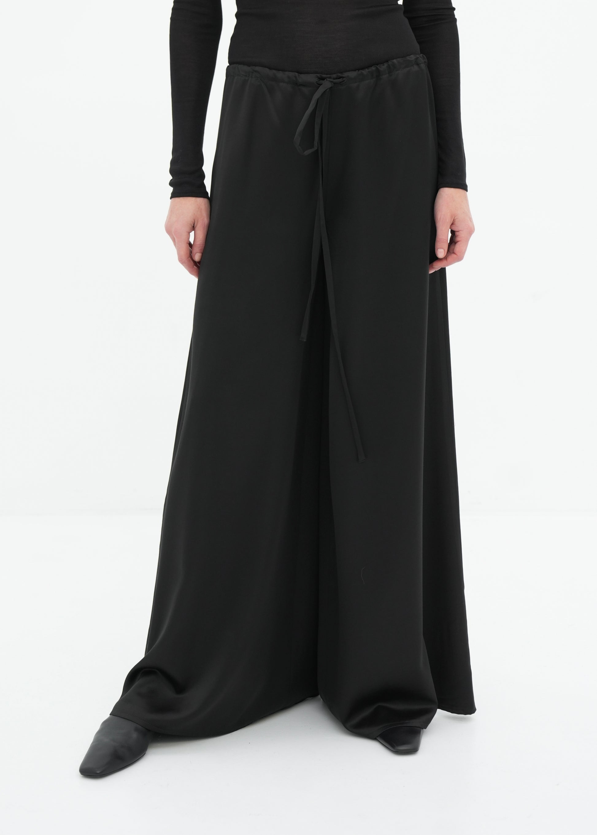 Cut from a refined blend of viscose and wool, these trousers fall in a clean, fluid line. The silhouette is intentionally wide and understated, designed to move softly with the body. Finished with a subtle drawstring waist for a precise, effortless fit. A timeless essential that aligns ease with elegance.