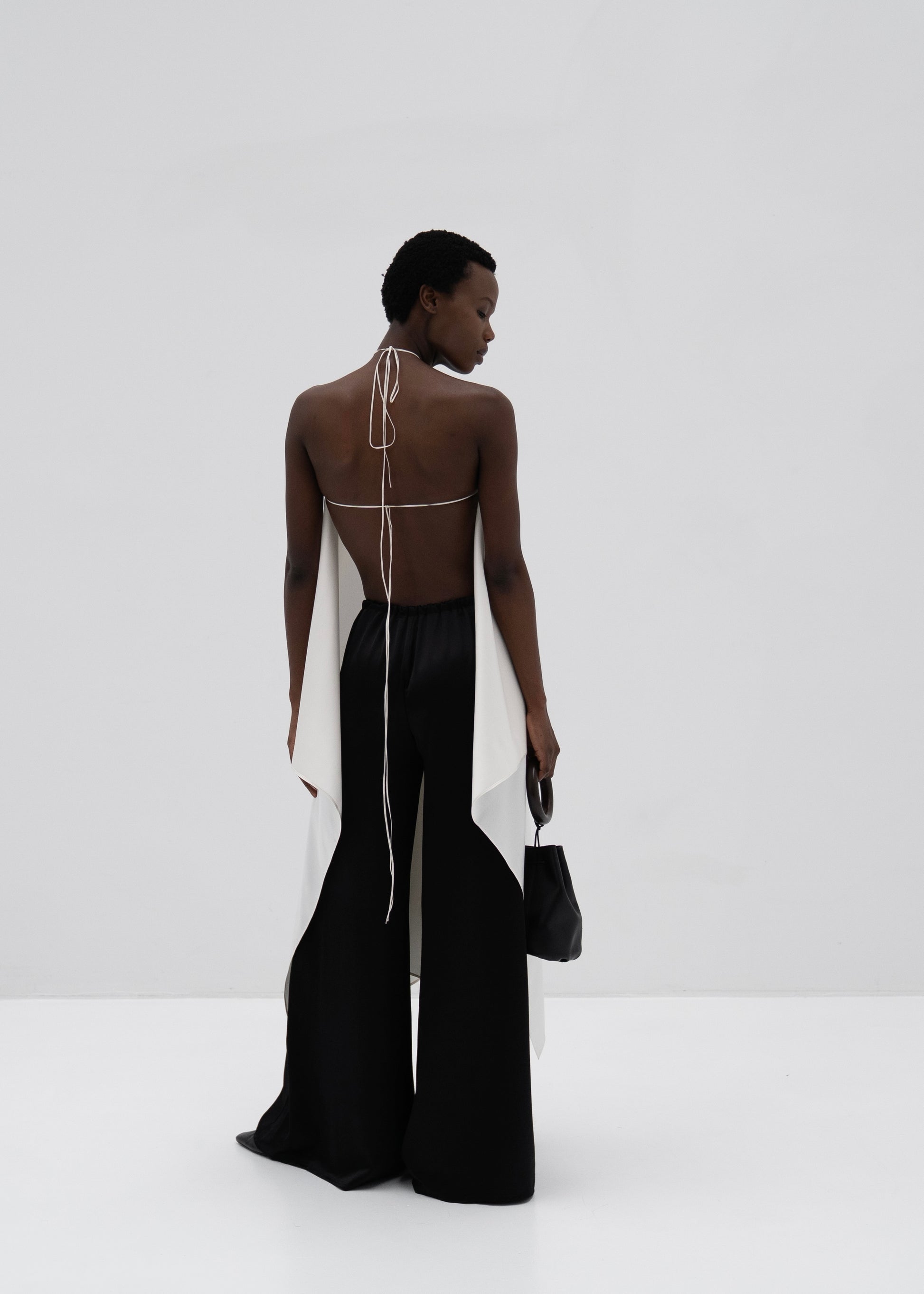 The open back is finished with delicate ties, allowing the piece to adjust naturally to the body while maintaining an effortless, elongated line. A hand-crafted wooden element anchors the neckline