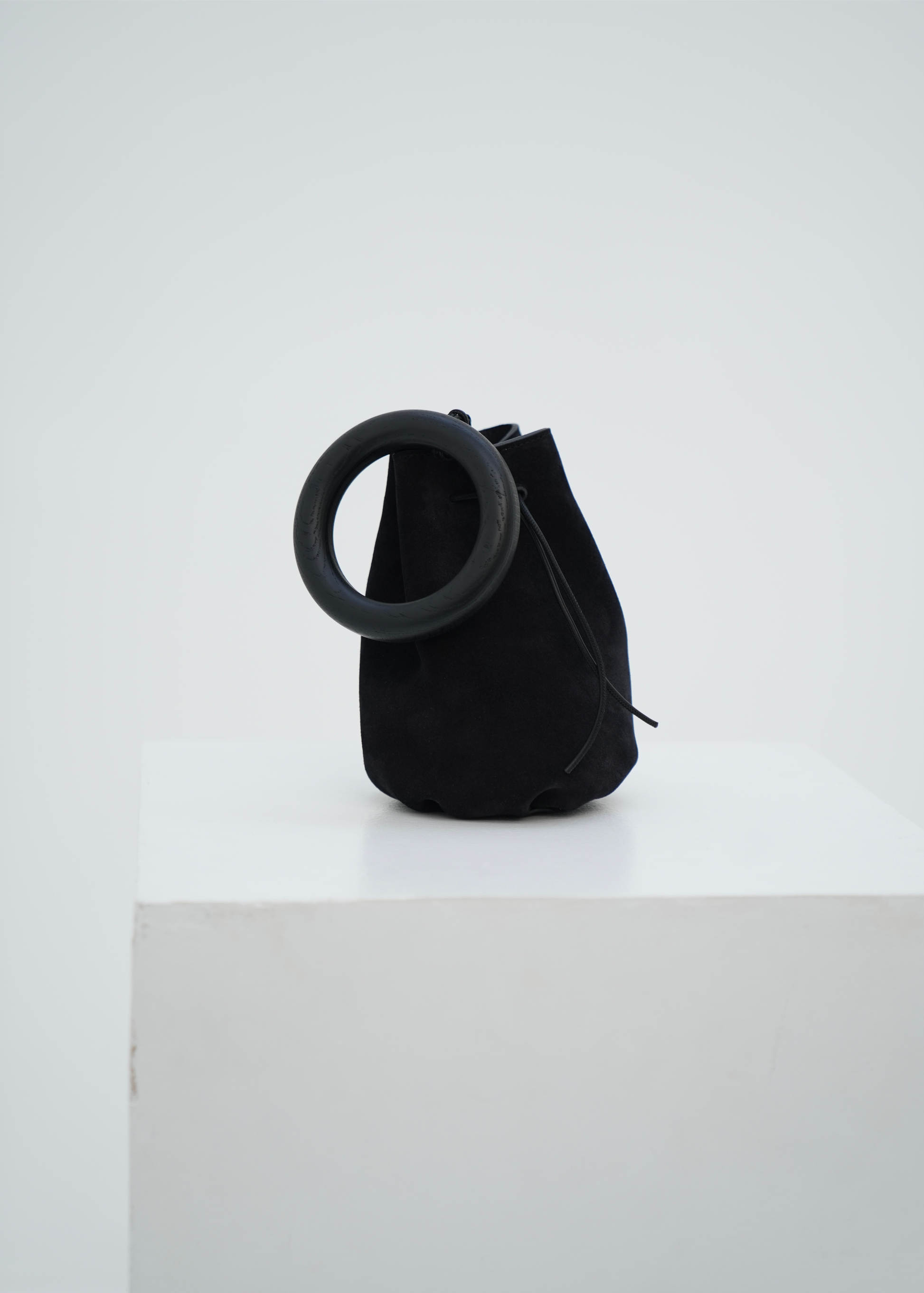 Crafted from black suede, the design is complemented by a circular handle that emphasizes the bag’s organic silhouette. The velvety texture of the suede adds depth and subtle softness, while the relaxed structure maintains a refined, understated elegance.