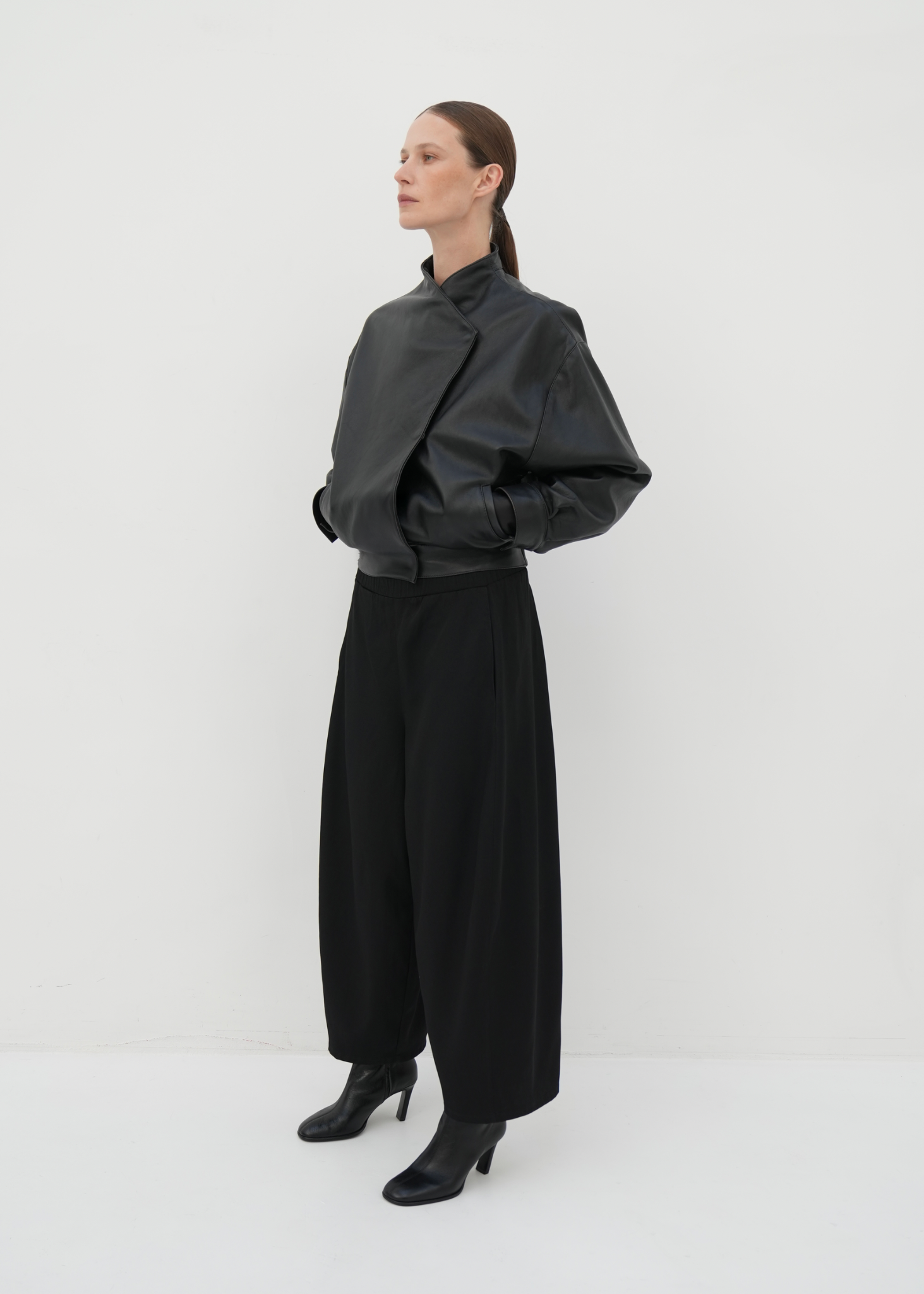 These wide-leg trousers are crafted with a clean architectural silhouette and soft volume. Designed with a mid-rise waist and precise front pleats, they create an elongated line while allowing ease of movement. The structured yet fluid fabric holds its shape beautifully, offering a modern balance between tailoring and comfort.